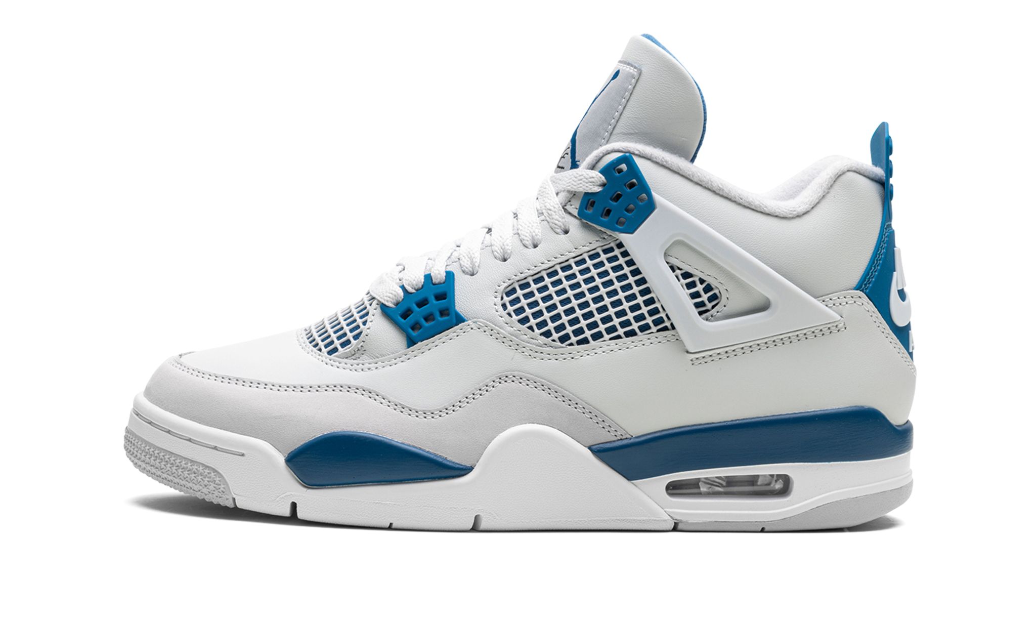 The Air Jordan 4 OG "Military Blue" is an original colorway of Michael Jordan’s fourth signature shoe that was re-released by Jordan Brand in May 2024. The Jordan 4 “Military Blue” is one of the retro basketball sneaker’s original colorways, and one of its rarest, too. The style was only released twice before, in 1989 and 2006, until it was brought back in 2024. The modern version of the “Military Blue” remains faithful to the original look, in that it features the same shape, color block, and “Nike Air” branding as the ‘89 version. The shoe has a white leather upper with a Neutral Grey overlay on the toe. Additional Neutral Grey accenting appears on the lace holder “wings.” White netting is layered over Military Blue mesh on the mid-panel and tongue. More Military Blue accenting comes into play on the mudguard and lace eyelets, and on the heel counter with “Nike Air” detailing. A blue Jumpman is found on the tongue. Underfoot, a white rubber midsole and grey rubber outsole complete the look.